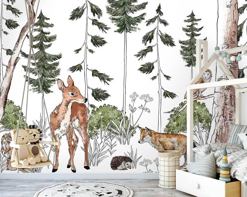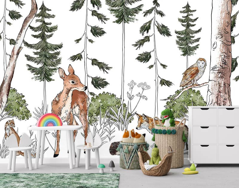 Schaffen Sie eine bezaubernde und verspielte Kulisse für das Zimmer Ihres Kindes mit unserer Fototapete Waldtierreich. Diese lebendige Fototapete zeigt eine üppige Waldlandschaft voller bunter Bäume und freundlicher Waldtiere wie Rehe, Kaninchen und Vögel. Sie bringt die natürliche Schönheit direkt in das Zimmer Ihres Kindes, wo sie die Fantasie anregt und ein Gefühl des Staunens hervorruft.