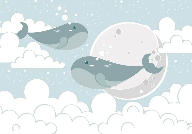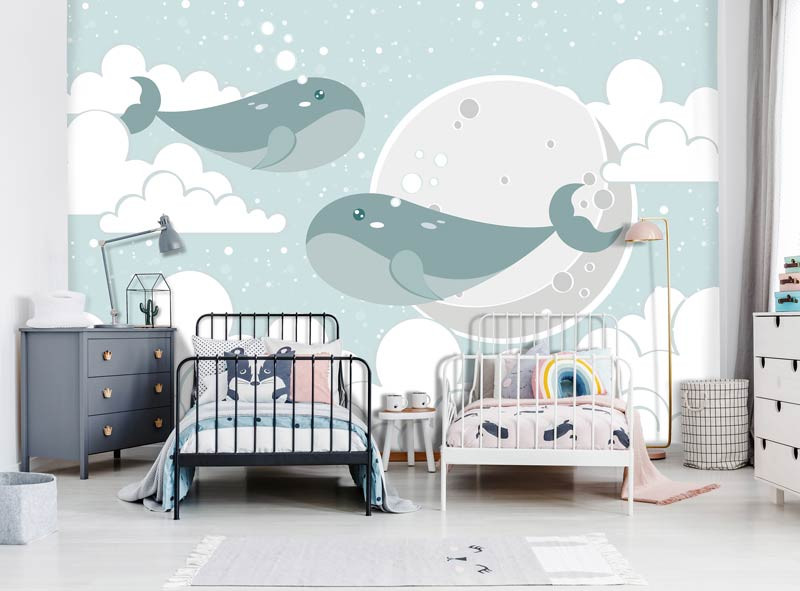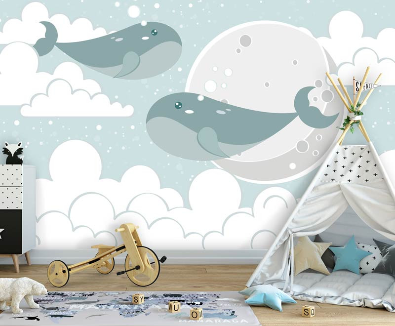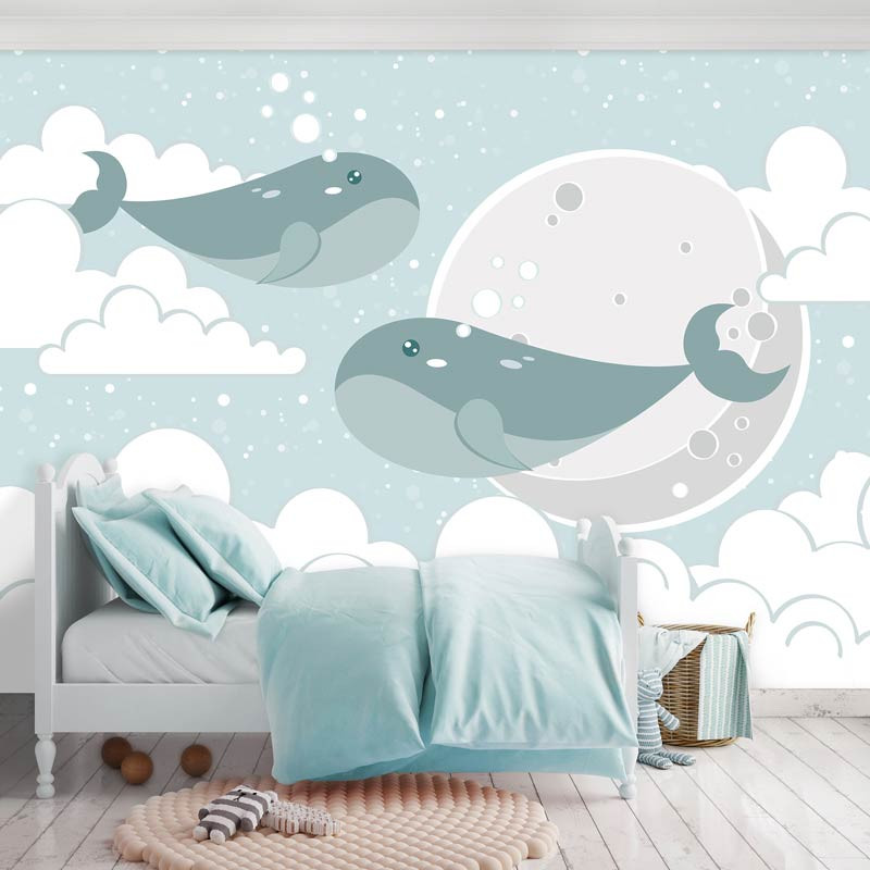Fototapete für Kleinkinder. Die Fototapete mit diesen Walen ist ein echter Hingucker in jedem Baby- oder Kinderzimmer.