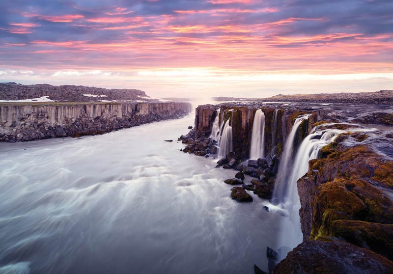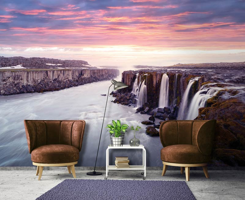Fototapete von einigen schönen Wasserfällen mit dem farbigen Himmel der untergehenden Sonne im Hintergrund.