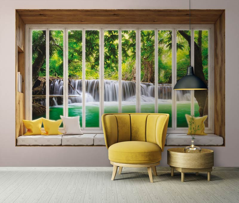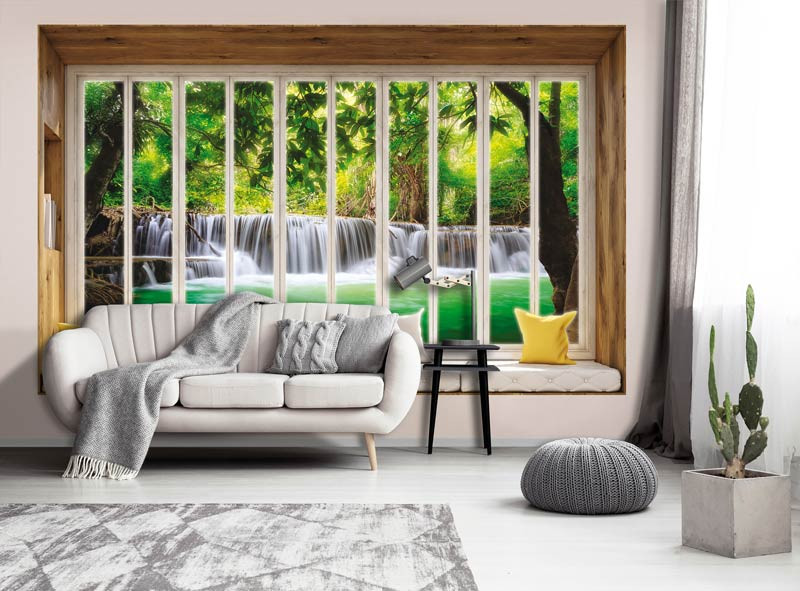 3D Vliestapete mit dem Blick auf einen schönen Wasserfall, gesehen durch das Fenster.