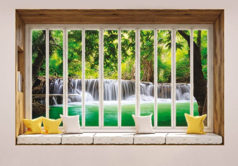 Fototapete Wasserfall Blick durch das Fenster 3D-Perspektive