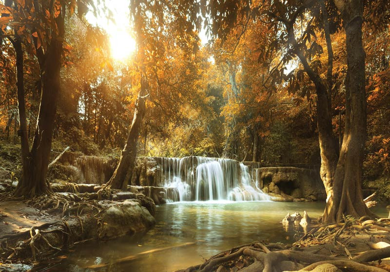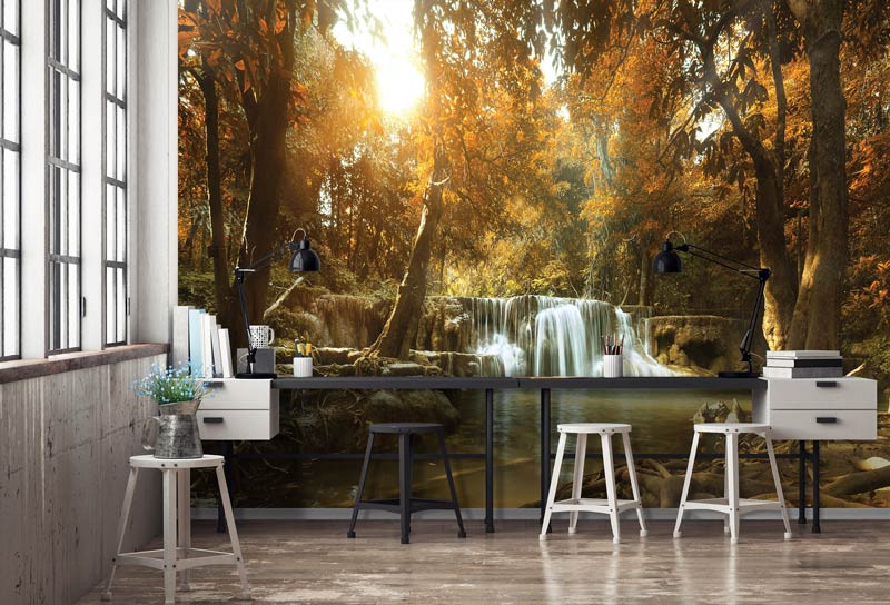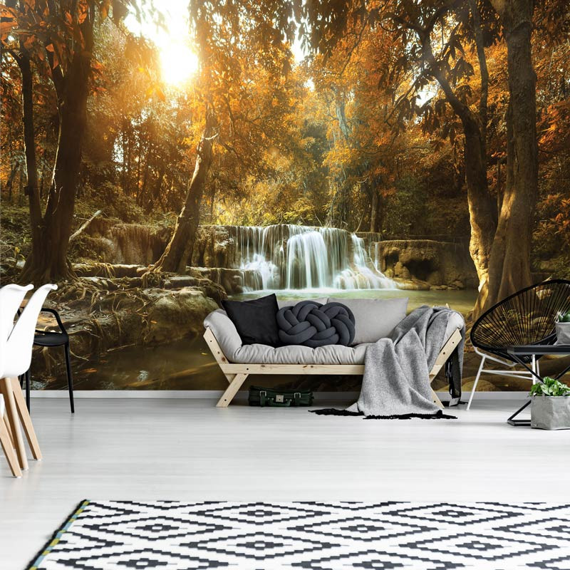 Vliestapete, die einen Wald mit einem schönen Wasserfall und herbstlichen Bäumen darstellt.