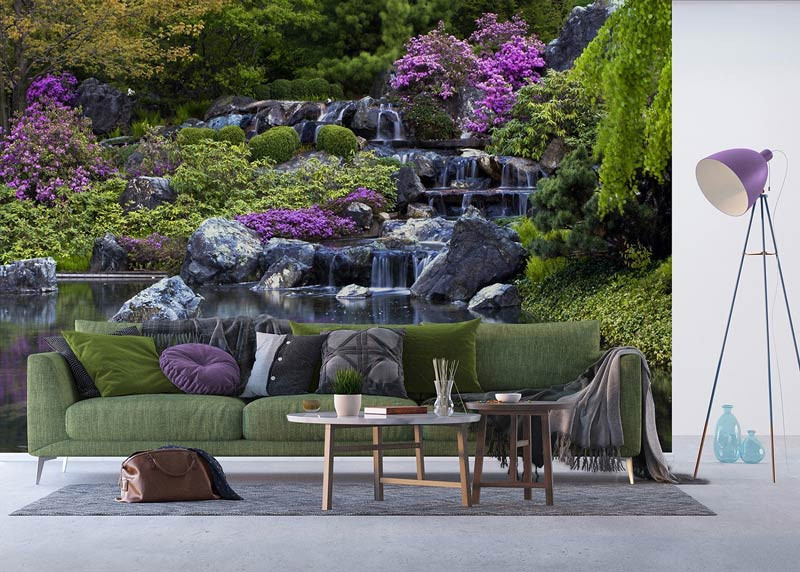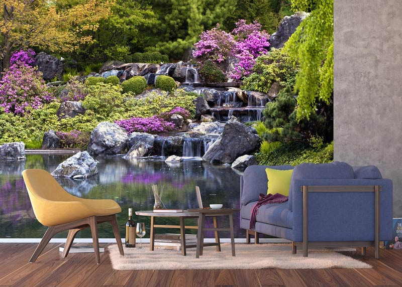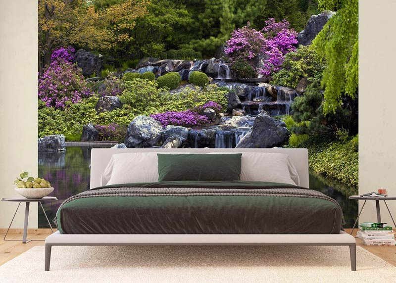 Holen Sie sich die heitere Schönheit eines japanischen Gartens mit Wasserfall in Ihr Zuhause. Die sanften Farben und das beruhigende Wasser schaffen eine ruhige und meditative Atmosphäre.