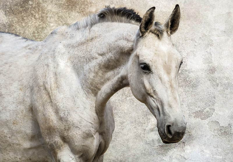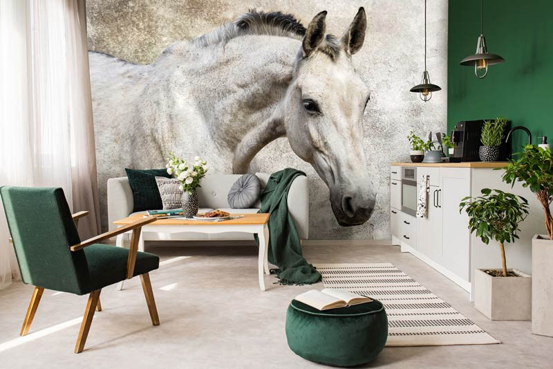 Fototapete weißes Pferd ist ein echter Blickfang im: Wohnzimmer, Schlafzimmer, Kinderzimmer, Hobbyraum, Küche, Flur, Büro oder jedem anderen Raum.