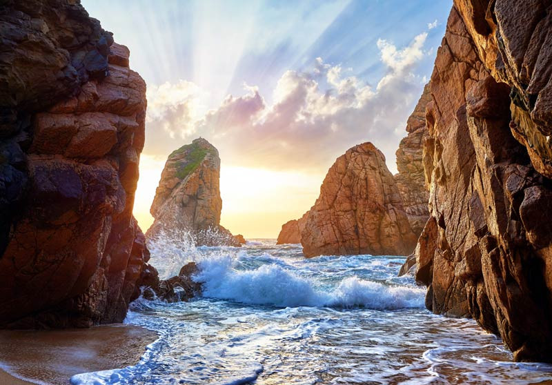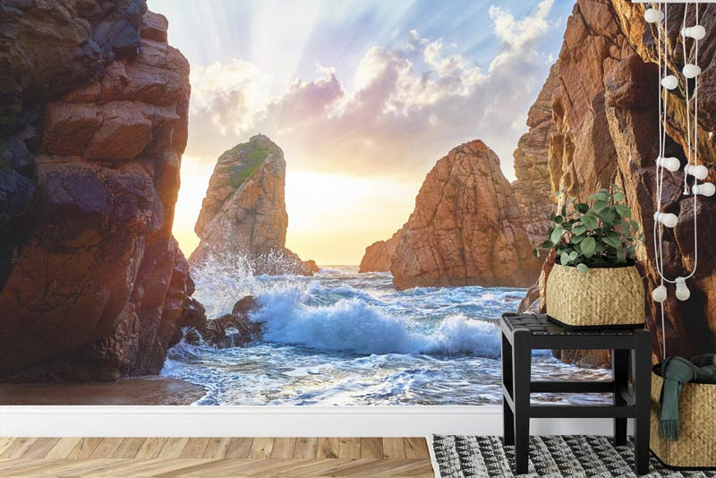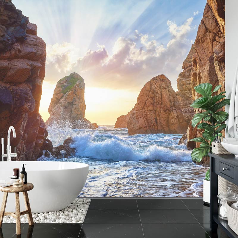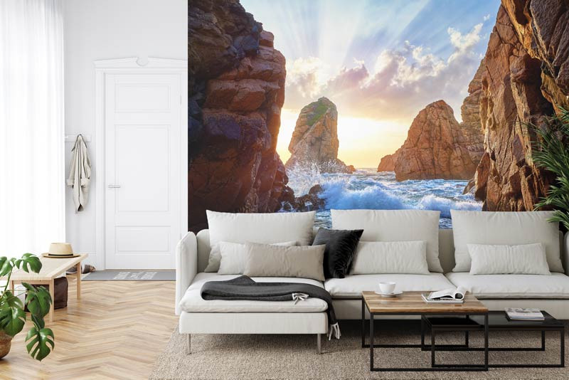 Lassen Sie sich mit der Fototapete Waves among the Rocks von der Kraft der Natur mitreißen. Erleben Sie das beruhigende Rauschen des Meeres und das Spiel der Wellen, die sich an den schroffen Felsformationen brechen.