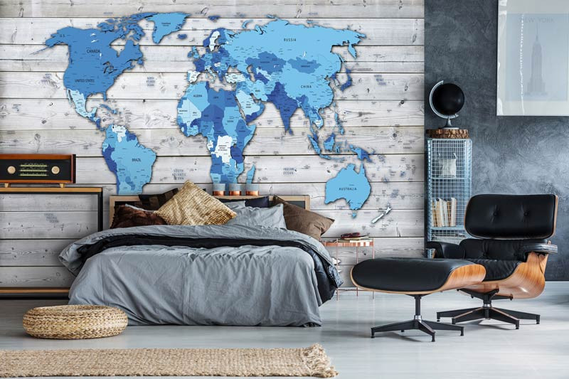 Vlies-Fototapete von blau gefärbten Weltkarte, angezeigt auf Holzplatten.