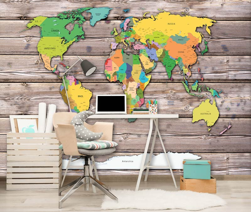 Vlies Fototapete von farbigen Weltkarte, auf Holzplatten angezeigt.