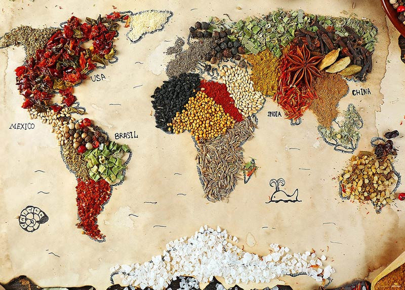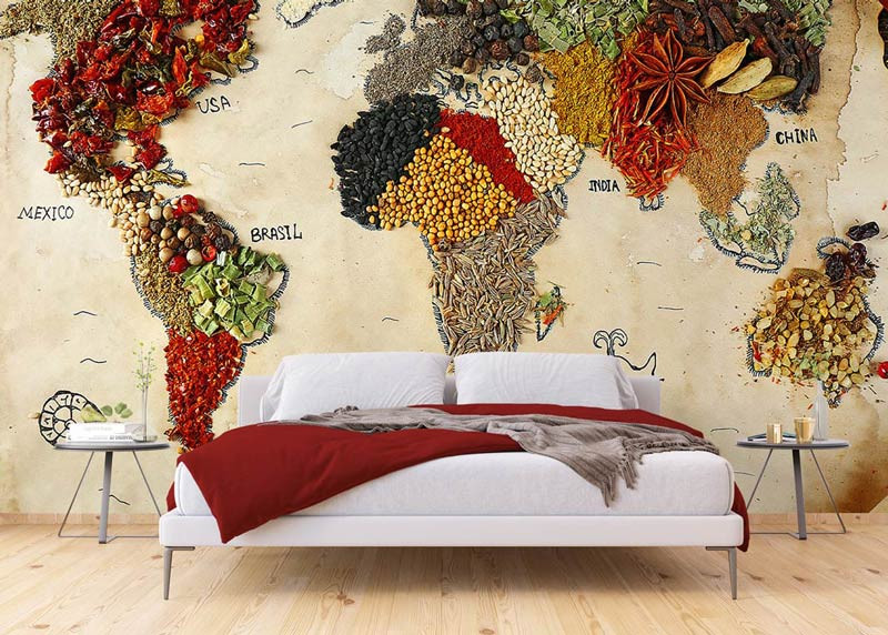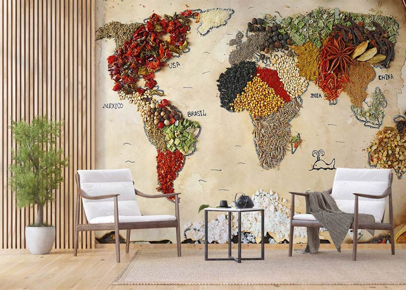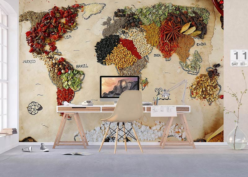 Verleihen Sie Ihrem Interieur einen Hauch von weltlichem Abenteuer mit dieser Fototapete einer mit Gewürzen verzierten Weltkarte. Die detaillierte Karte ist von bunten Kräutern und Gewürzen umgeben, die eine warme, exotische Atmosphäre schaffen. Perfekt für Küchen, Esszimmer oder Wohnzimmer, in denen ein einzigartiger kultureller Touch gewünscht ist.