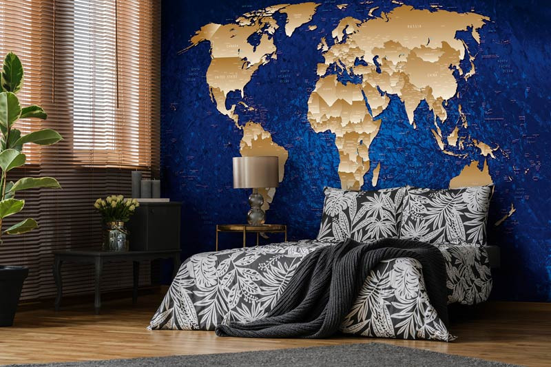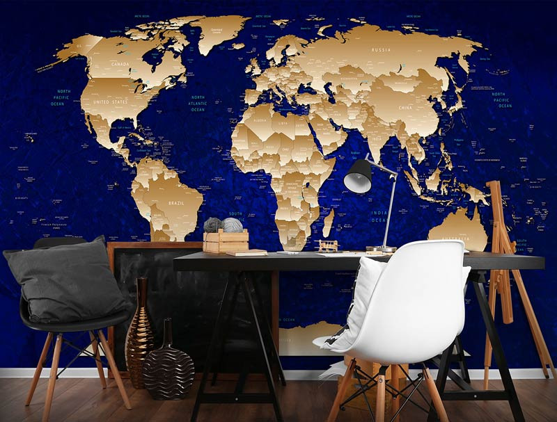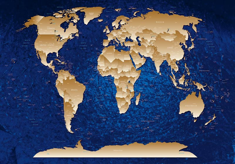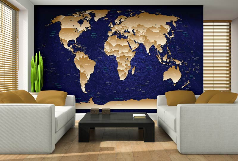 Vlies Fototapete mit einer goldfarbenen Weltkarte.