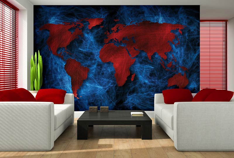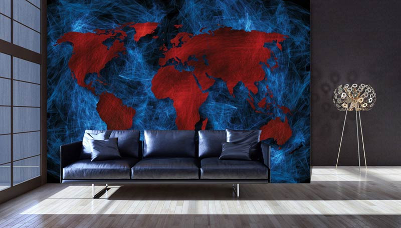 Vlies-Fototapete mit einer roten abstrakten Weltkarte auf einem malerischen blauen Hintergrund.