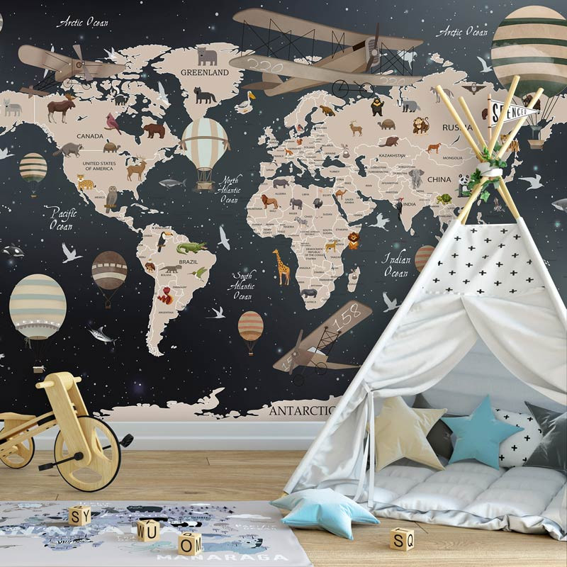 Die Fototapete Weltkarte ist eine Bereicherung für jedes Kinderzimmer.
