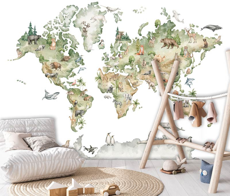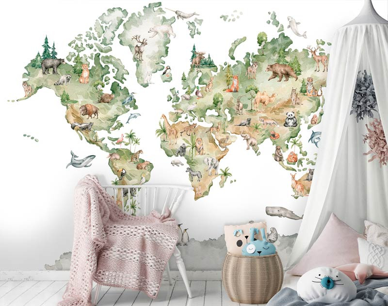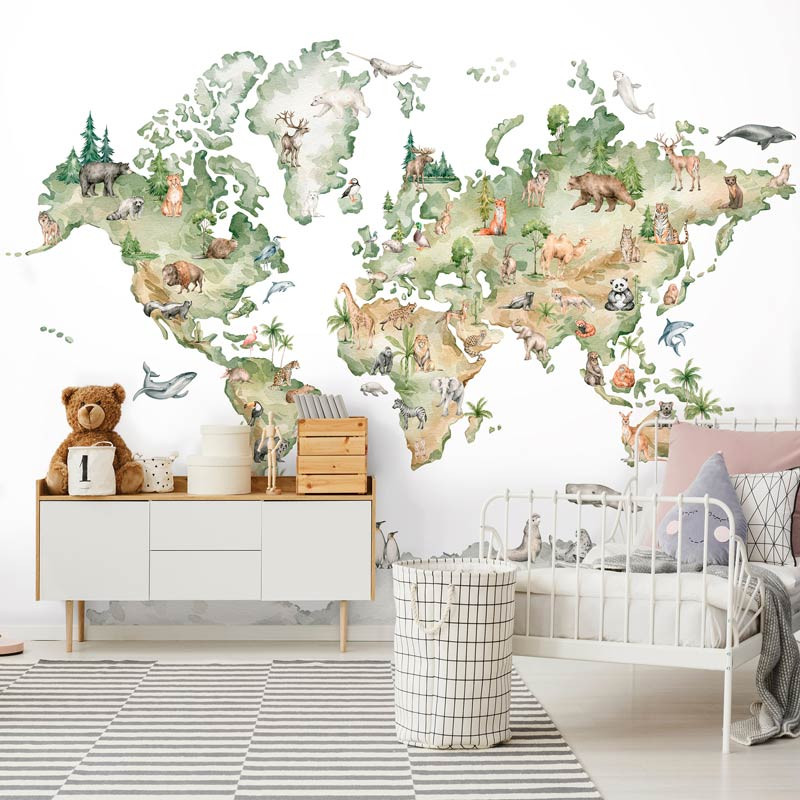 Die Fototapete der Weltkarte mit Tieren ist ein echter Hingucker und schafft einen einzigartigen Look im Kinderzimmer, Schlafzimmer, Wohnzimmer oder jedem anderen Raum.