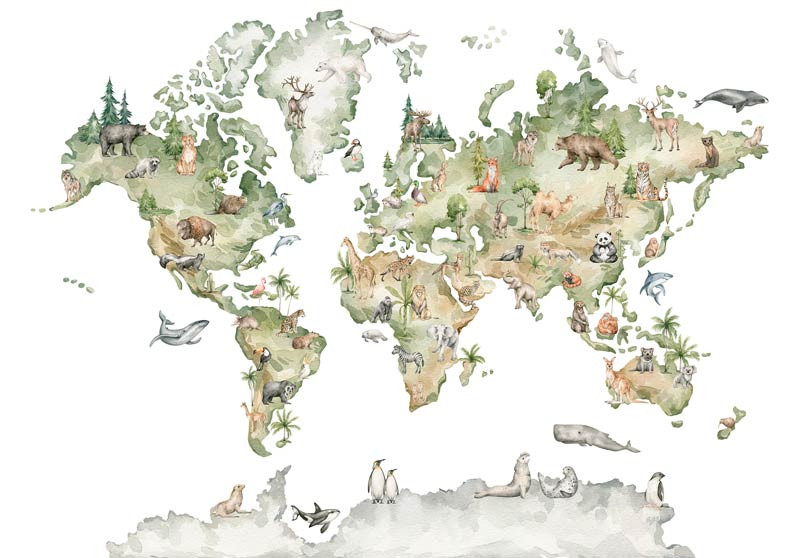 Fototapete der Weltkarte und des Tierreichs. Die Tiere befinden sich an denselben Orten, an denen sie auch im echten Leben leben.