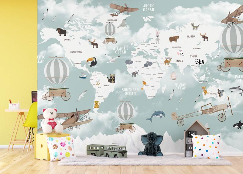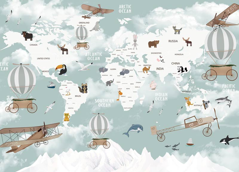 Bringen Sie mit der Fototapete Weltkarte Tierisches Abenteuer ein lehrreiches und spielerisches Element in Ihr Kinderzimmer. Dieses farbenfrohe Design zeigt eine Weltkarte voller niedlicher Tiere aus verschiedenen Kontinenten, die Kindern auf spielerische Art und Weise die Welt entdecken lassen. Diese Tapete ist sowohl lehrreich als auch dekorativ.