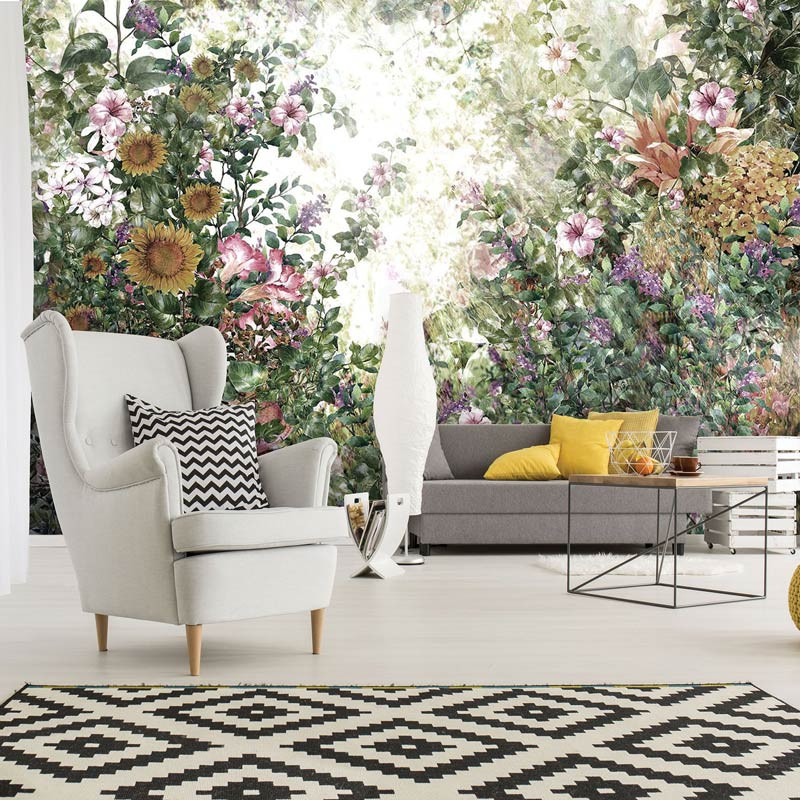Die Fototapete Garten voller Blumen ist ein echter Blickfang im: Wohnzimmer, Schlafzimmer, Hobbyraum, Küche, Flur, Büro oder jedem anderen Raum.