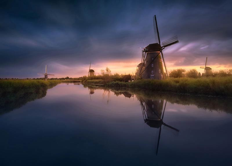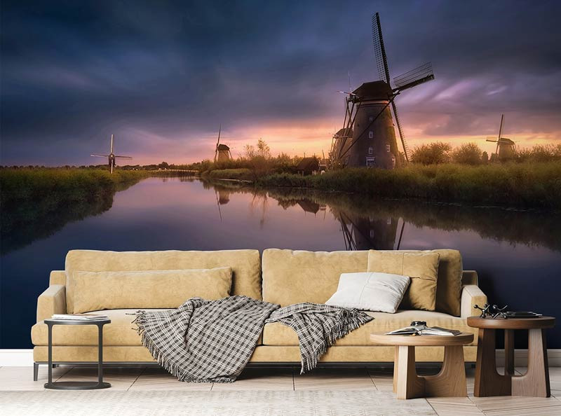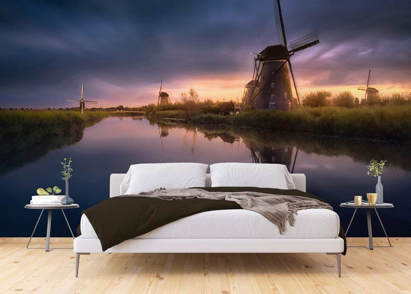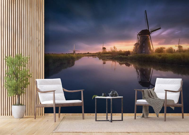 Holen Sie sich mit dieser Fototapete mit Windmühlen bei Sonnenuntergang einen Hauch von holländischer Tradition in Ihr Zuhause. Die warmen, orangefarbenen und roten Töne verleihen dem Raum einen nostalgischen und charmanten Touch.