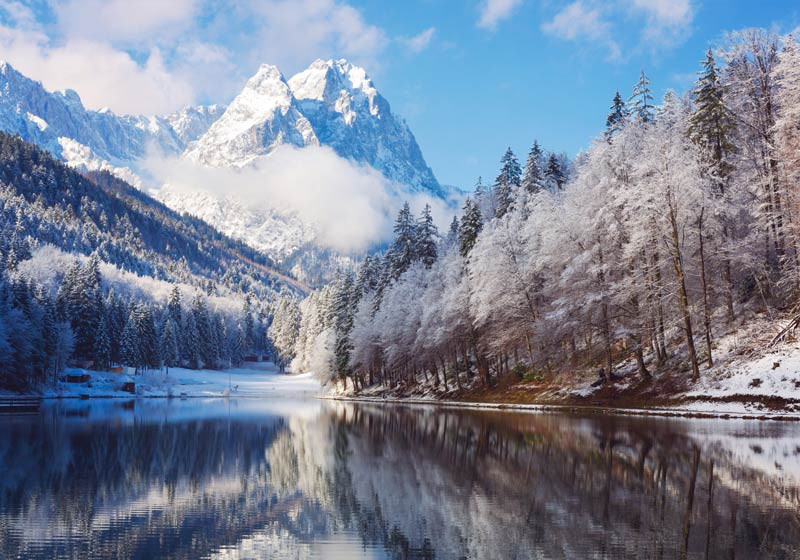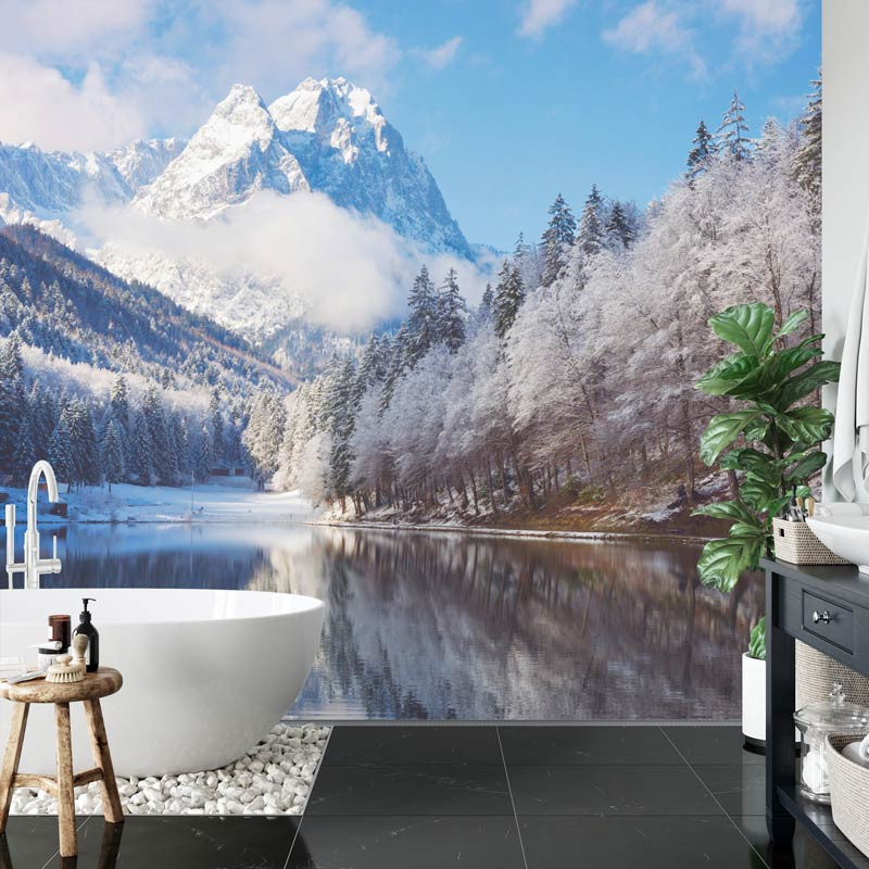 Lassen Sie sich von der märchenhaften Pracht der Fototapete Winterlandschaft verzaubern. Erleben Sie die Ruhe der verschneiten Landschaften, der gefrorenen Seen und der mit Kiefern besetzten Bäume, die dieses Winterwunderland ausmachen.
