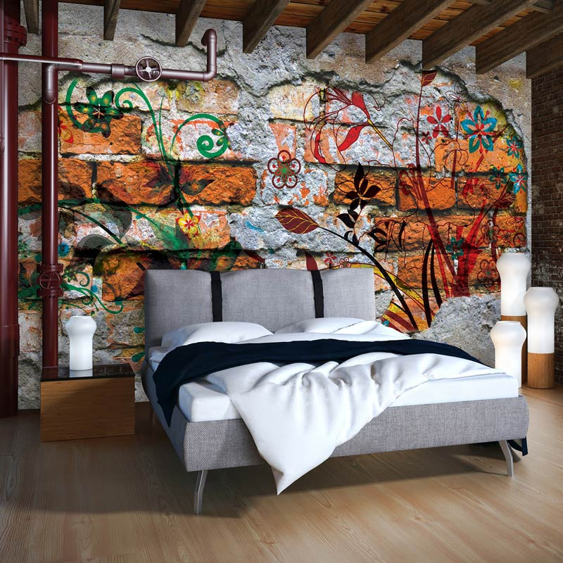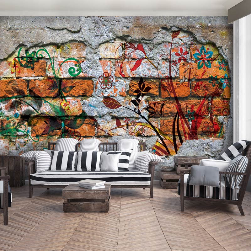 Fototapete einer Ziegelwand mit gemalten Blumen.