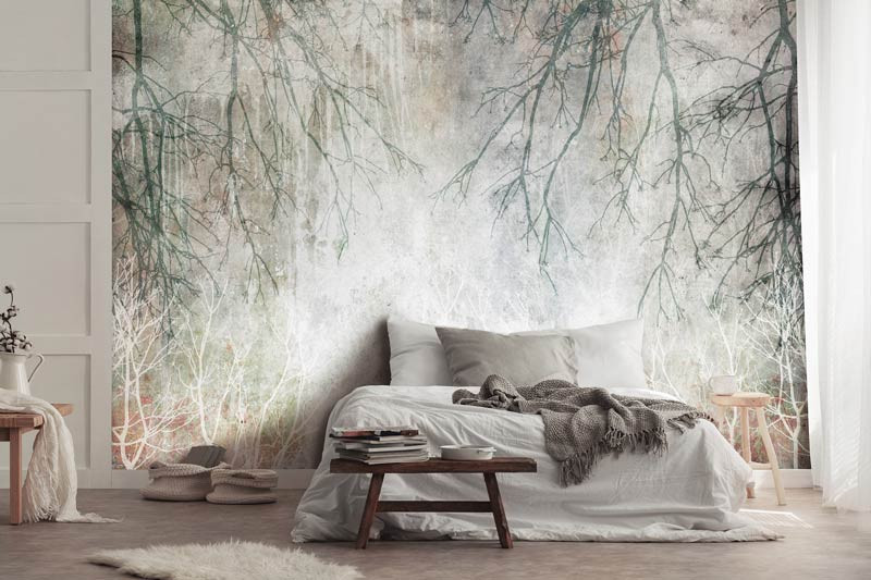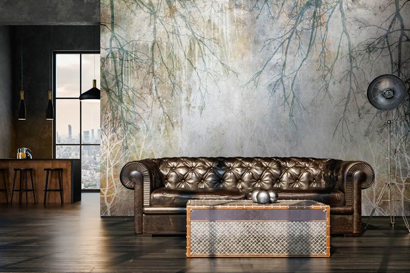 Lassen Sie die Natur Ihr Interieur zum Leben erwecken mit unserer schönen Fototapete mit Ästen von Bäumen auf einer rostigen Betonwand! Diese Tapete ist perfekt für alle, die den rohen, industriellen Look in Kombination mit der Schönheit der Natur lieben.