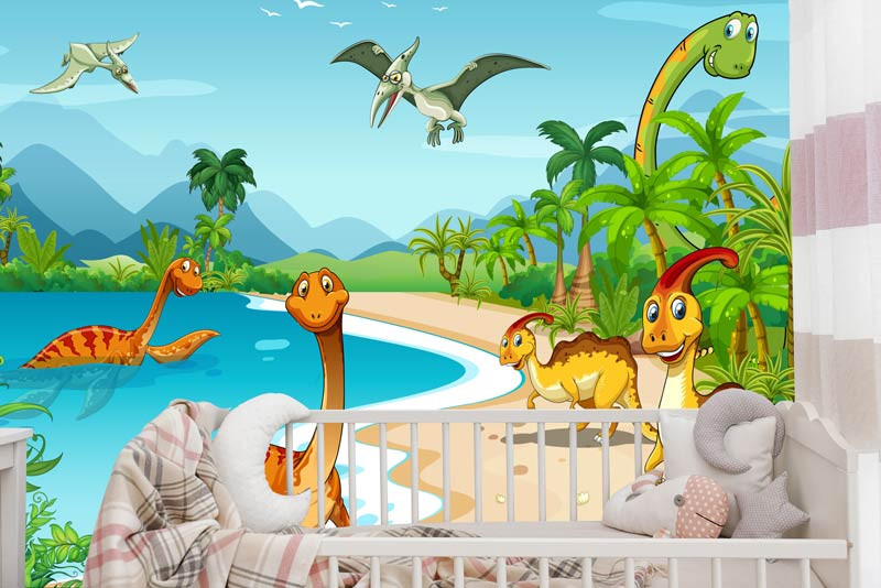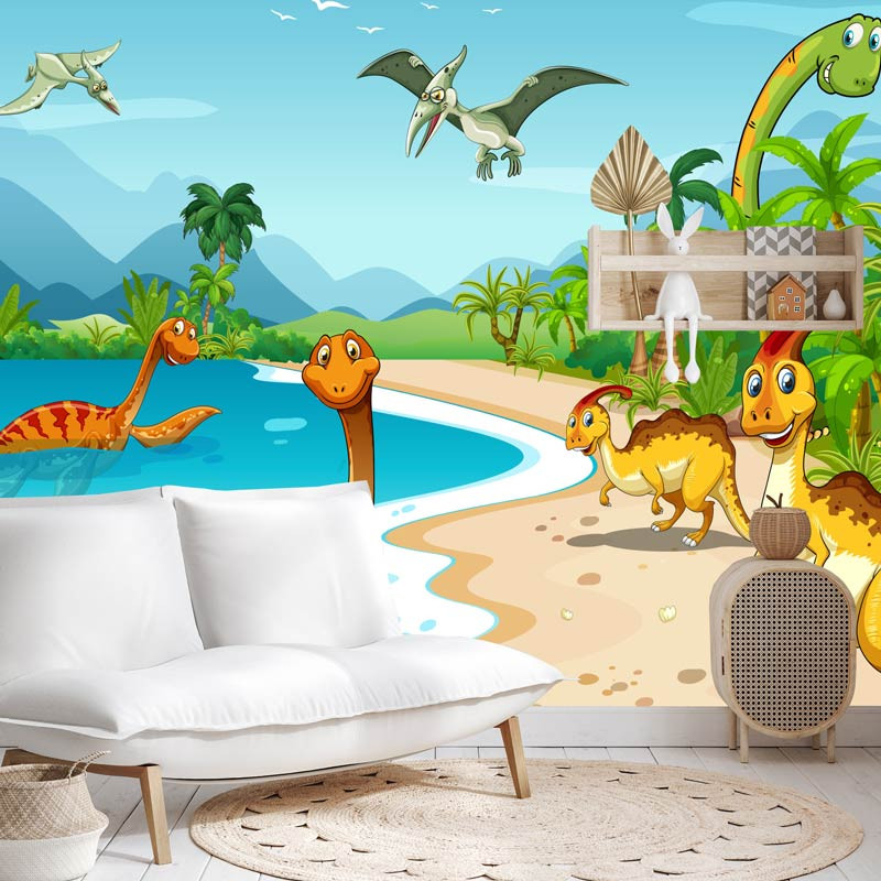 Schaffen Sie mit unserer Fototapete Fröhliche Dinosaurier eine verspielte und lebendige Dekoration im Kinderzimmer. Führen Sie Ihre Kinder in eine bunte Welt voller prähistorischer Freude und Abenteuer.