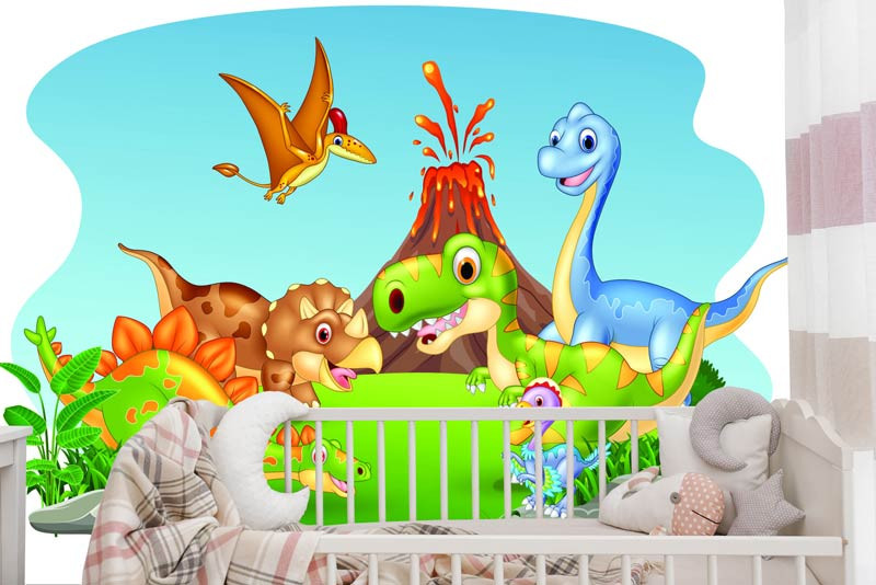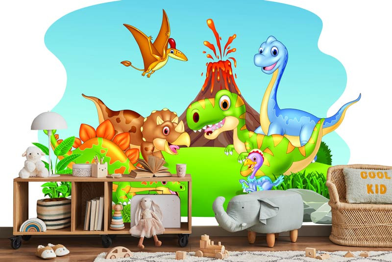 Bringen Sie Abenteuer und Fröhlichkeit ins Kinderzimmer mit unserer Fototapete Fröhliche Dinosaurier vor dem Vulkan. Schaffen Sie eine lebendige Umgebung, in der Ihre Kinder spielen und von Begegnungen mit freundlichen Dinosauriern in einer prähistorischen Umgebung fantasieren können.