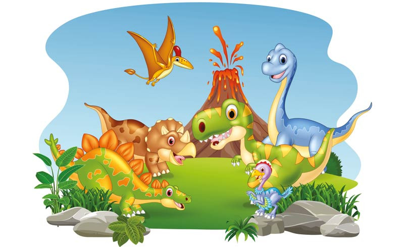 Fototapete Fröhliche Dinosaurier vor dem Vulkan