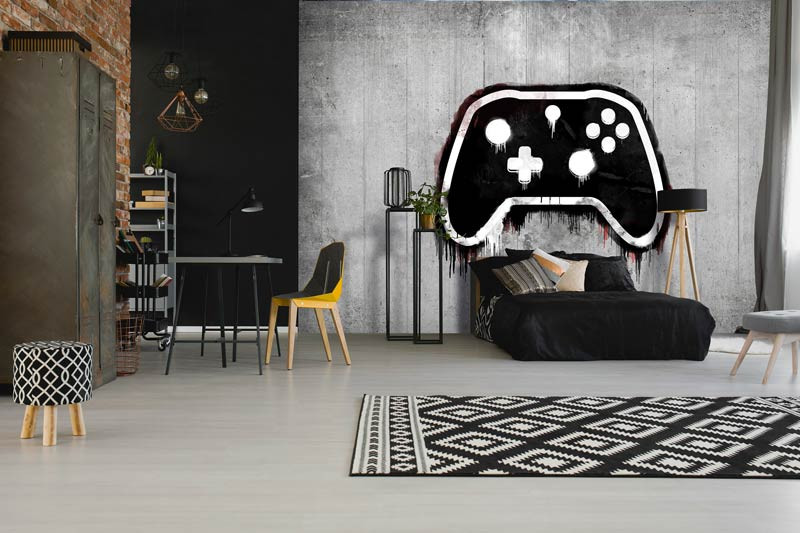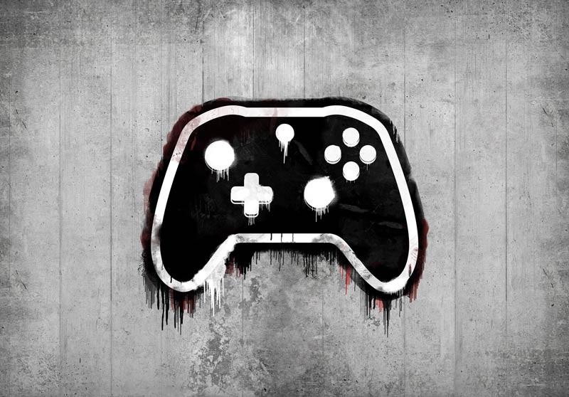 Spiel-Fototapete für die echten Gamer. Fototapete eines Game Controllers, der mit Graffiti auf eine Betonwand gesprüht wurde.