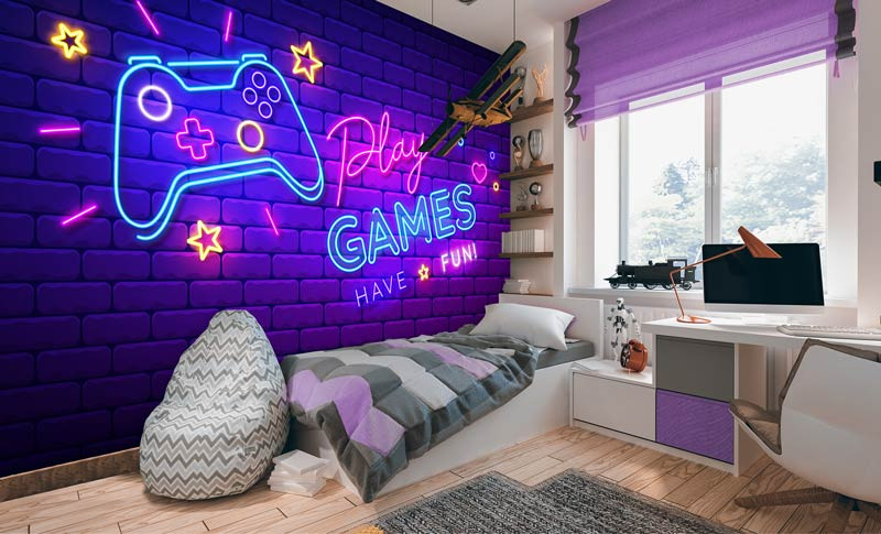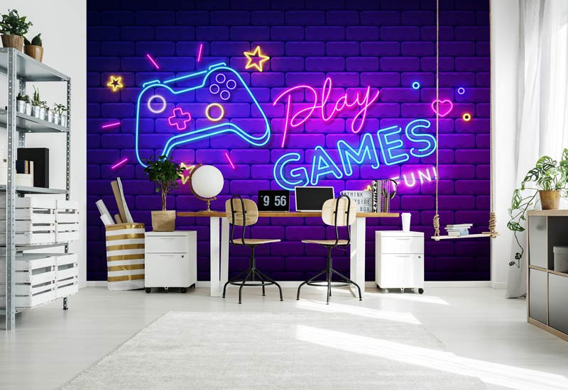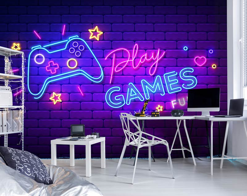 Tapete für die echten Gamer. Eine neonbeleuchtete Wand, die zusätzlich mit leuchtenden Dekorationen und Neonbuchstaben beleuchtet wird.