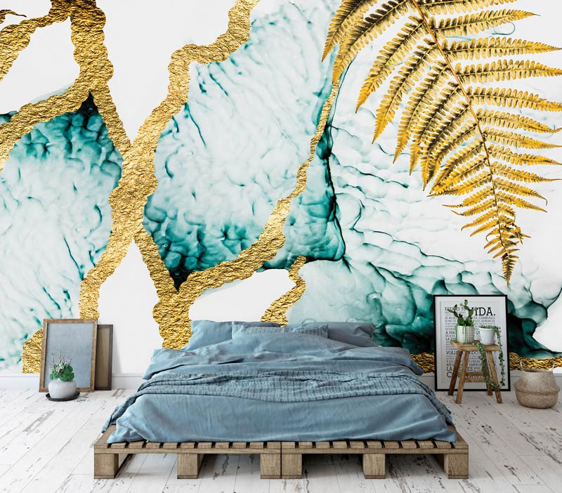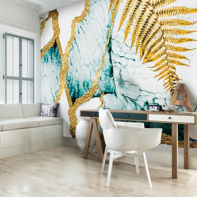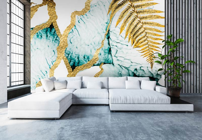 Luxuriöse Fototapete einer Marmorwand mit goldenen Verzierungen wie z.B. einem goldenen Farn. Marmor-Fototapeten sind heutzutage sehr beliebt, da sie von echtem Marmor kaum zu unterscheiden sind.