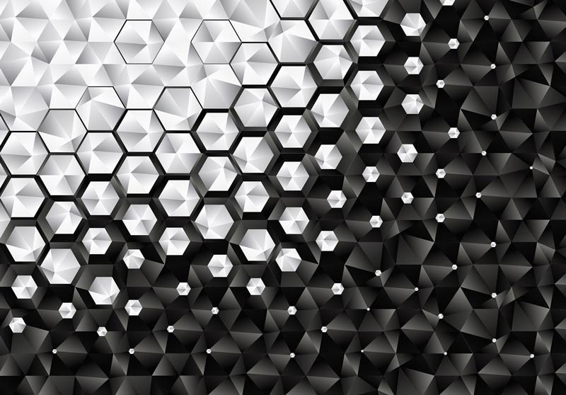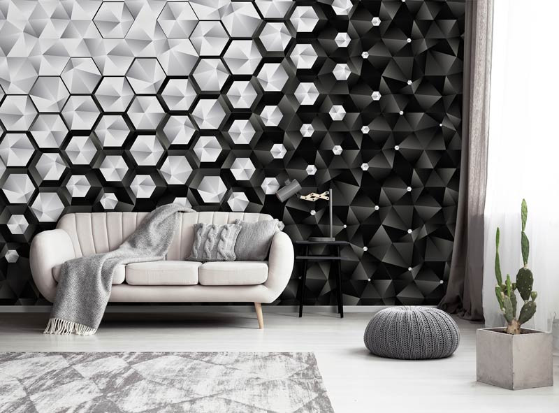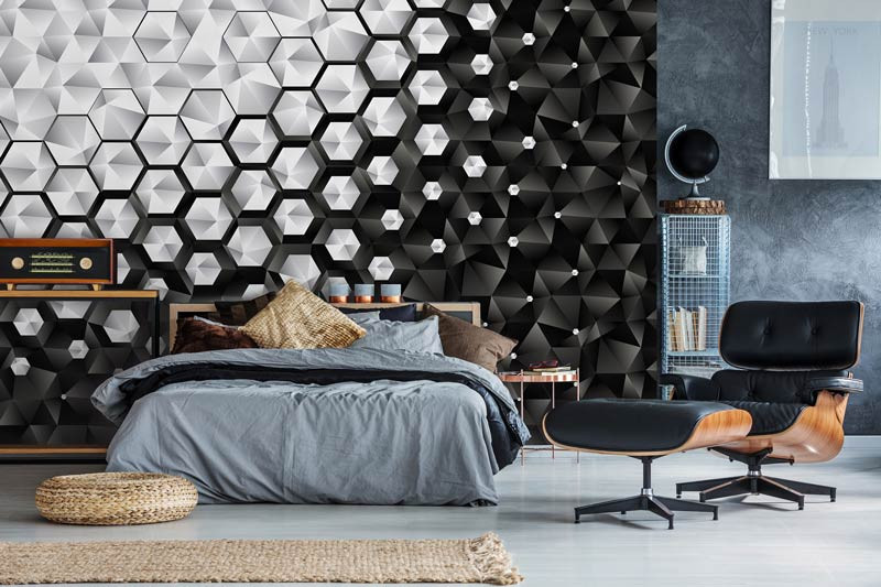Vliestapete aus allen geometrischen, silbernen Sechsecken. Die Tiefe, die durch das Muster entsteht, schafft einen tollen 3D-Effekt!