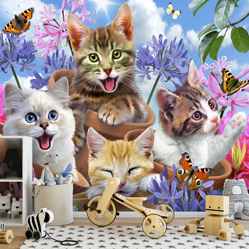 Vlies-Fototapete mit süßen Kätzchen und schönen Schmetterlingen. Bringt Farbe in jedes Kinderzimmer!