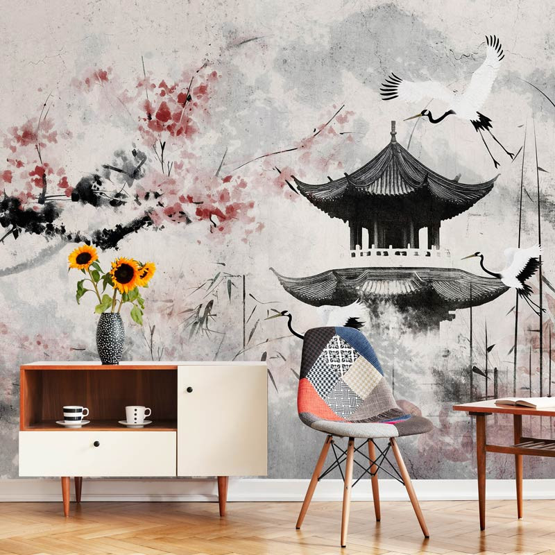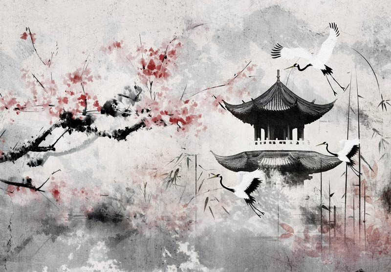Bringen Sie die Raffinesse der japanischen Kunst in Ihr Zuhause mit der Fototapete Japanische Kirschblüte und Reiher im Kunststil. Dieses bezaubernde Design kombiniert anmutige Reiher mit zarten Kirschblüten in einem künstlerischen Stil, wodurch ein harmonisches und elegantes Ganzes entsteht. Die sanften Farben und fließenden Linien schaffen eine heitere Atmosphäre, perfekt für Liebhaber der orientalischen Kunst und der natürlichen Schönheit.