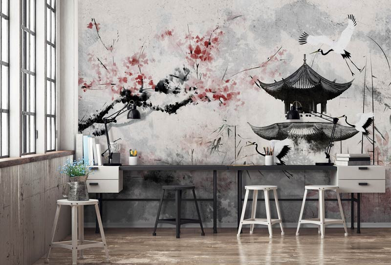 Kunst-Stil Japanische Kirschblüte und Reiher Fototapete