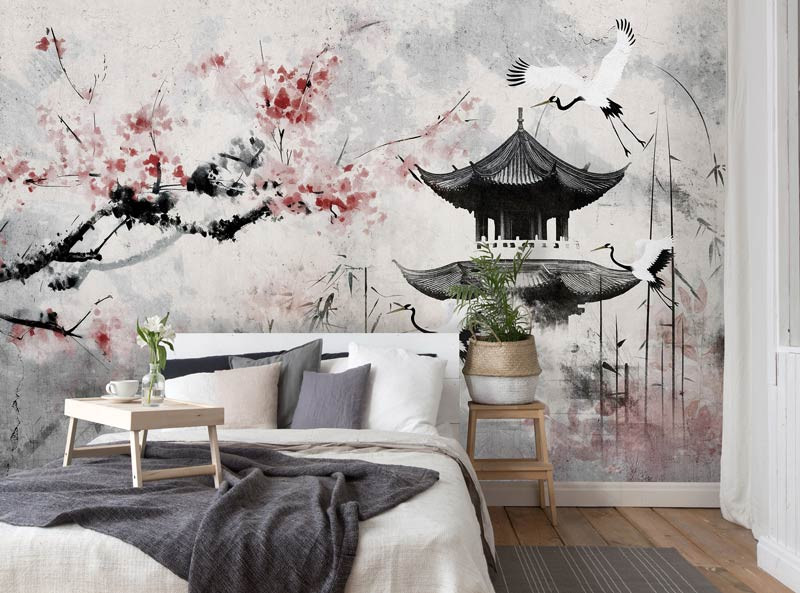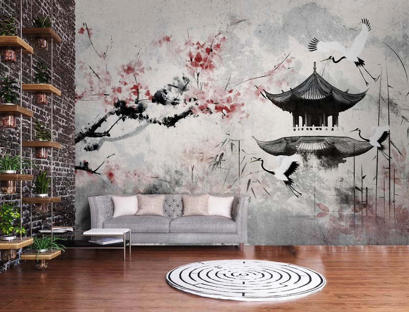 Fototapete Japanische Kirschblüte und Reiher im Kunststil