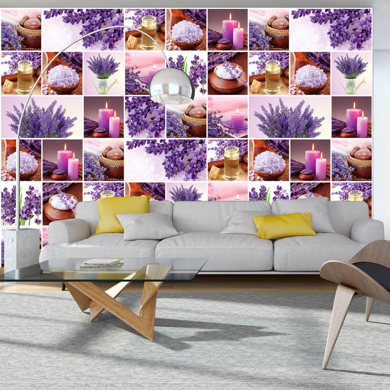 Vlies-Fototapete mit einer Collage voller Lavendel, Kerzen und mehr.