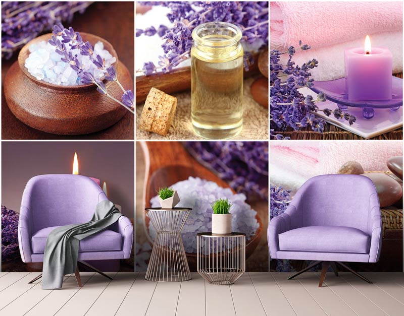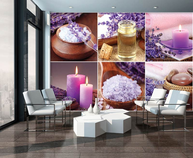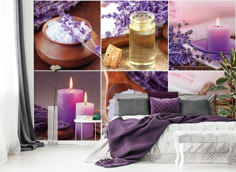 Vlies-Fototapete einer Collage voll von Lavendel, Kerzen und mehr.