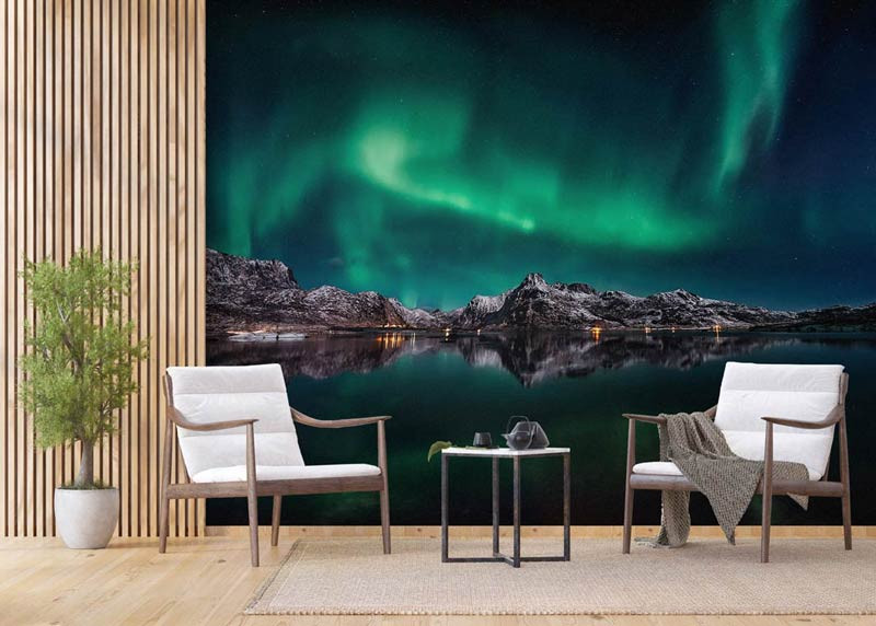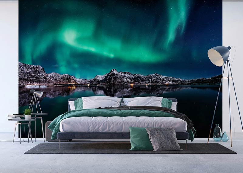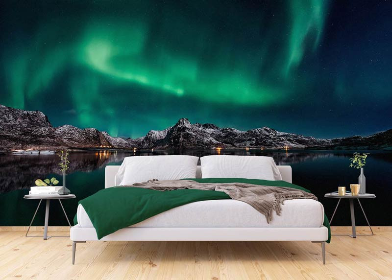 Erleben Sie die Magie des Nordlichts mit dieser Fototapete voller leuchtender Grün- und Blautöne. Die Intensität der Farben und die realistischen Details erwecken dieses Naturwunder zum Leben und schaffen eine verträumte, bezaubernde Atmosphäre.
