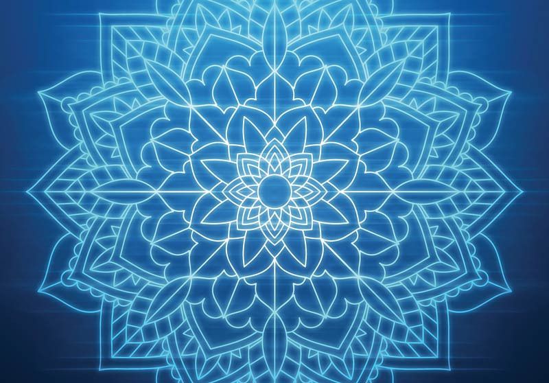 Vliestapete eines schönen, azurblauen Mandalas, das auf einem abstrakten blauen Hintergrund dargestellt ist. Mandalas sind schillernde kreisförmige Figuren mit symmetrischen Elementen.