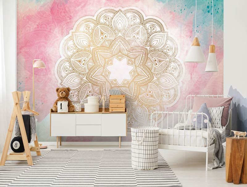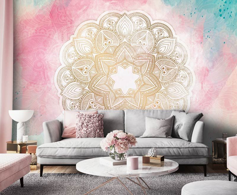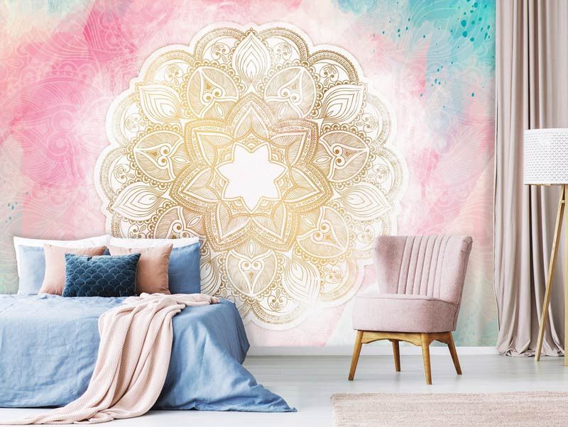 Fototapete eines schönen Mandalas, das in Pastellfarben gehalten ist. Mandalas sind schillernde kreisförmige Figuren mit symmetrischen Elementen.