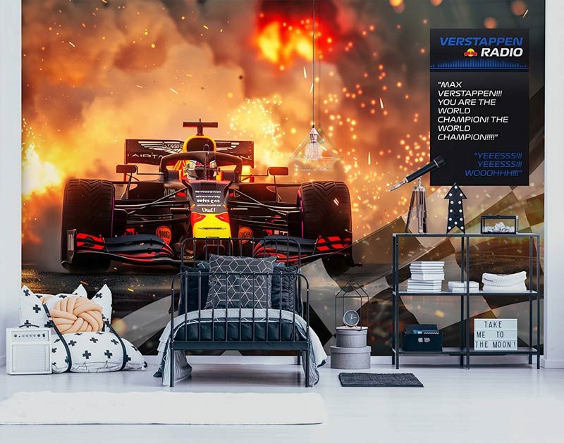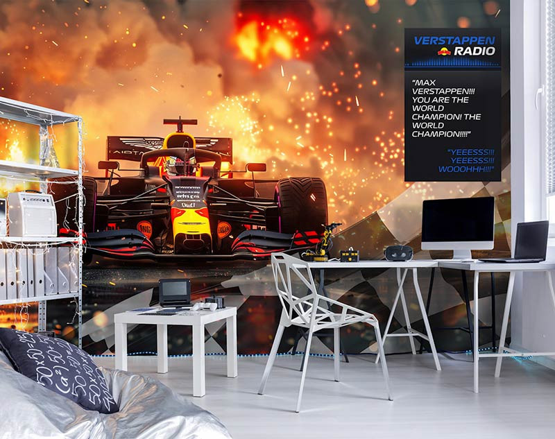 Bitte beachten Sie, dass diese Fototapete kein echtes Foto von Max Verstappen oder seinem Formel-1-Auto zeigt. Die Bilder und die Werbung auf dem Auto sind komplett fiktiv und dienen nur zu dekorativen Zwecken.