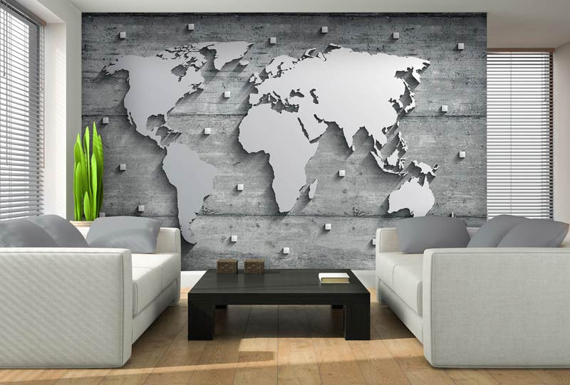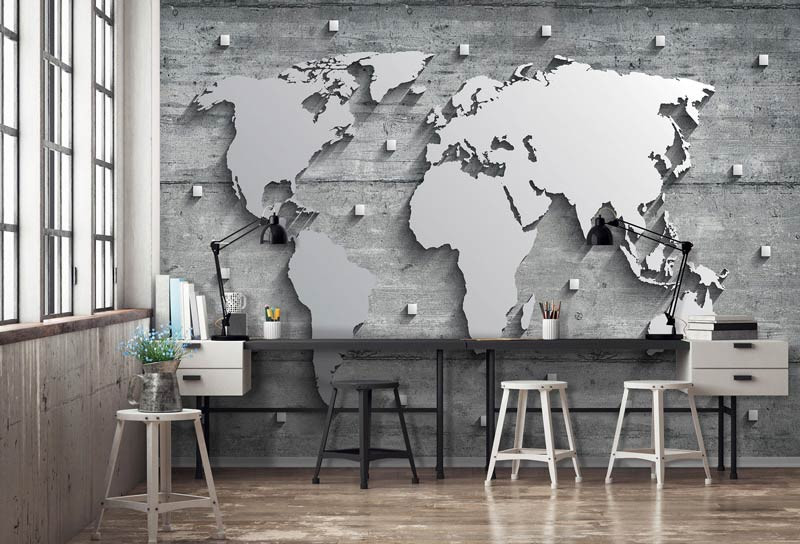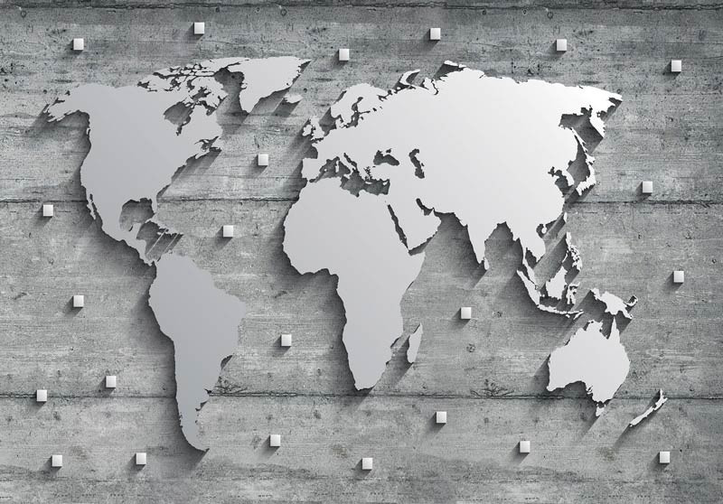 Fototapete einer silbernen Metall-Weltkarte auf einem konkreten Hintergrund.
