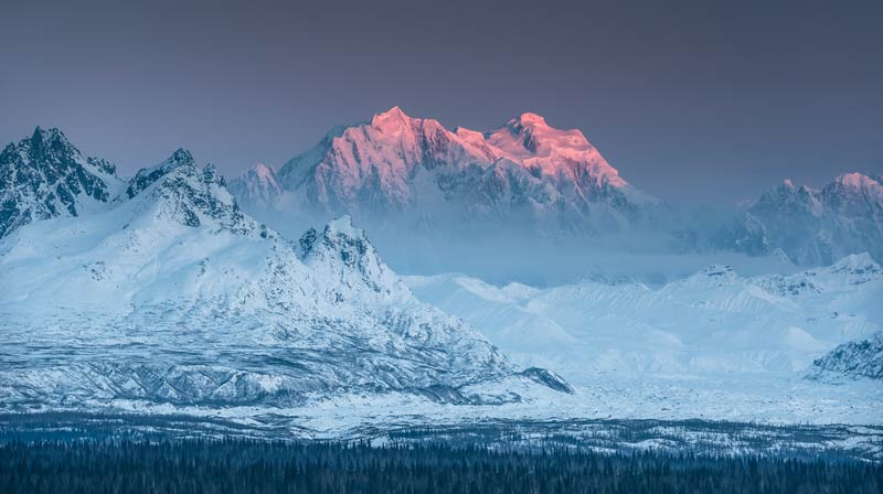 Eisige Bergwelten finden sich in der Alaska Range: Der imposante Mount Stevens dominiert majestätisch die eisige Ebene.