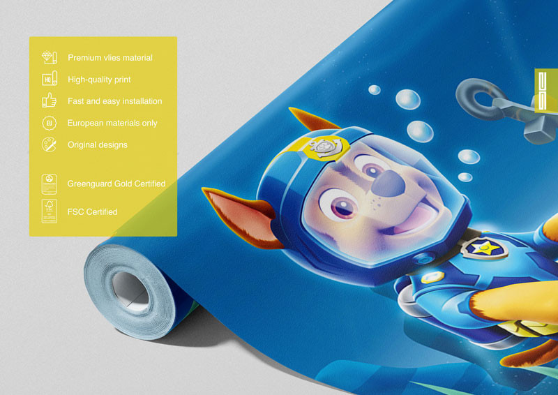 Die Paw Patrol Diving Adventures Fototapete ist perfekt für das Kinderzimmer, das Spielzimmer oder jeden anderen Raum, der eine spielerische und abenteuerliche Atmosphäre gebrauchen kann.