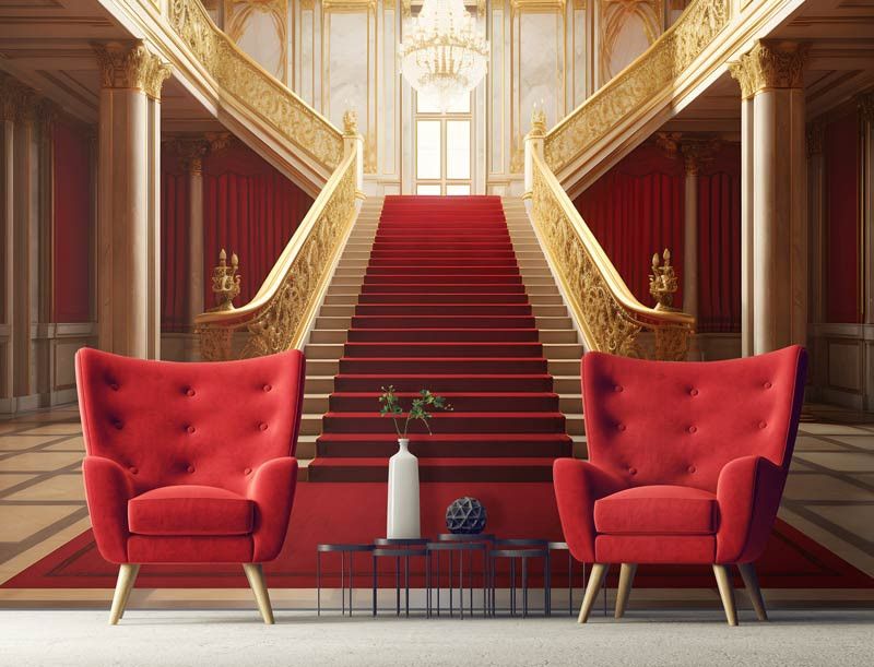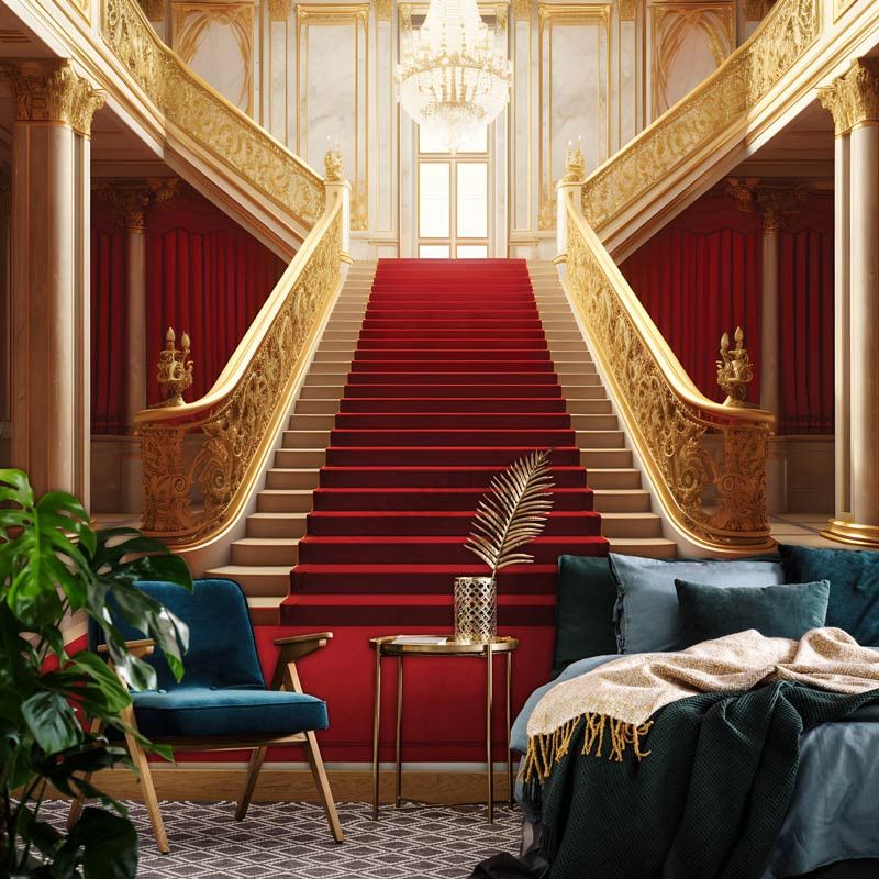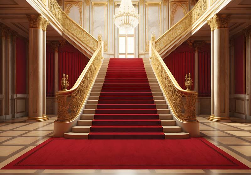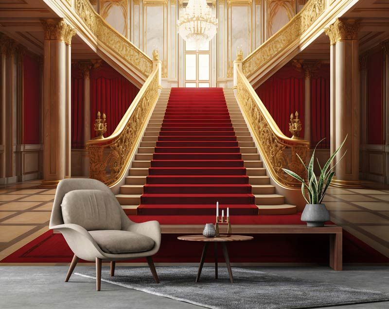 Tauchen Sie ein in die Welt der königlichen Pracht mit unserer Fototapete Royal Staircase 3D. Diese majestätische Fototapete mit goldenen Details zeigt eine opulente Treppe in einem Gebäude mit königlichem Charme, die in jedem Raum ein Gefühl von Erhabenheit und Eleganz hervorruft. Sie ist ideal für Liebhaber königlicher Architektur und historischer Pracht und eignet sich hervorragend für das Wohnzimmer, das Esszimmer oder den Empfangsbereich.