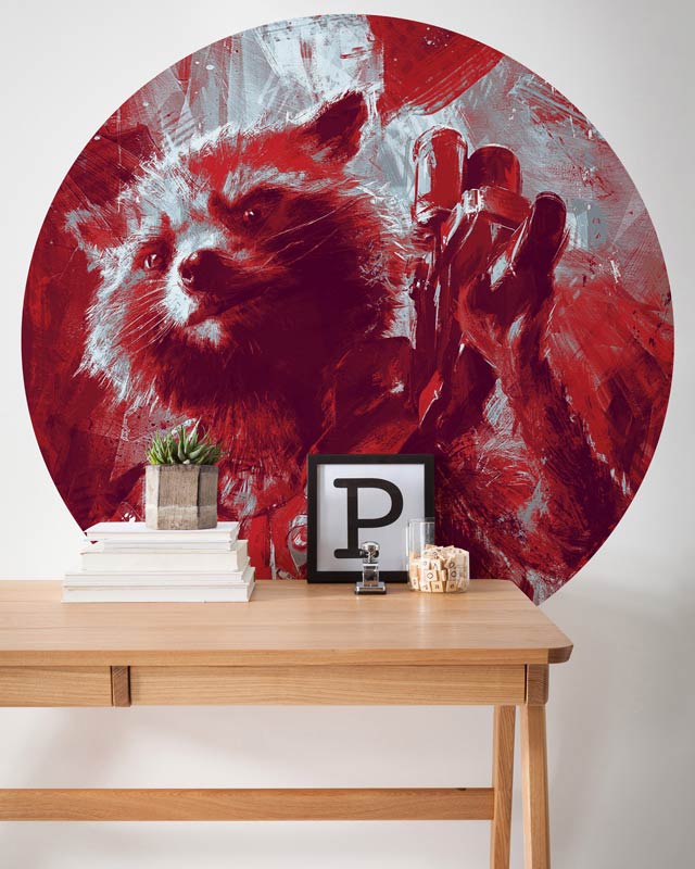 Der Marvel-Tapetenkreis von Rocket Raccoon kommt auf selbstklebender, hochwertiger Vliestapete.