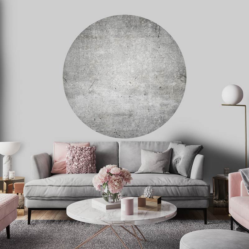 Die runde Tapete mit der Betonmauer ist ein echter Blickfang und verleiht jedem Raum eine industrielle Ausstrahlung.
