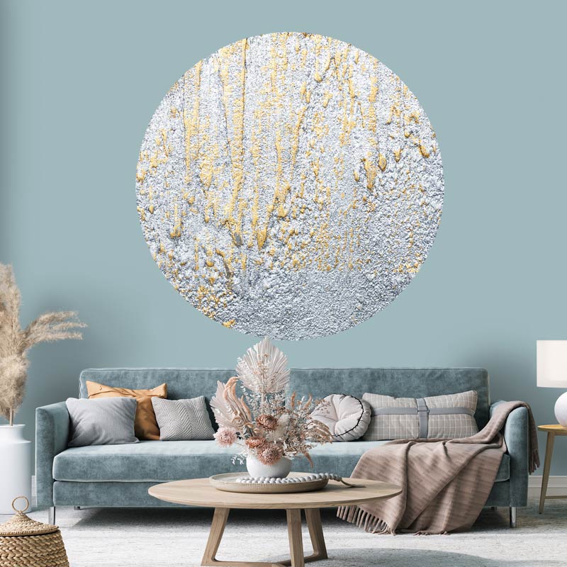 Die runde Tapete mit der gold- und silberfarbenen Putzoptik ist ein echter Blickfang und verleiht jedem Raum eine luxuriöse Ausstrahlung.