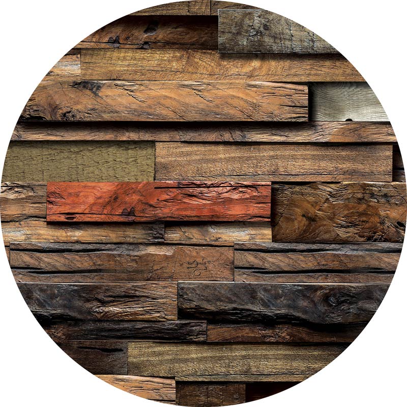 Runde Tapete mit verschiedenen Arten industrieller Holzbretter, dargestellt in 3D.
