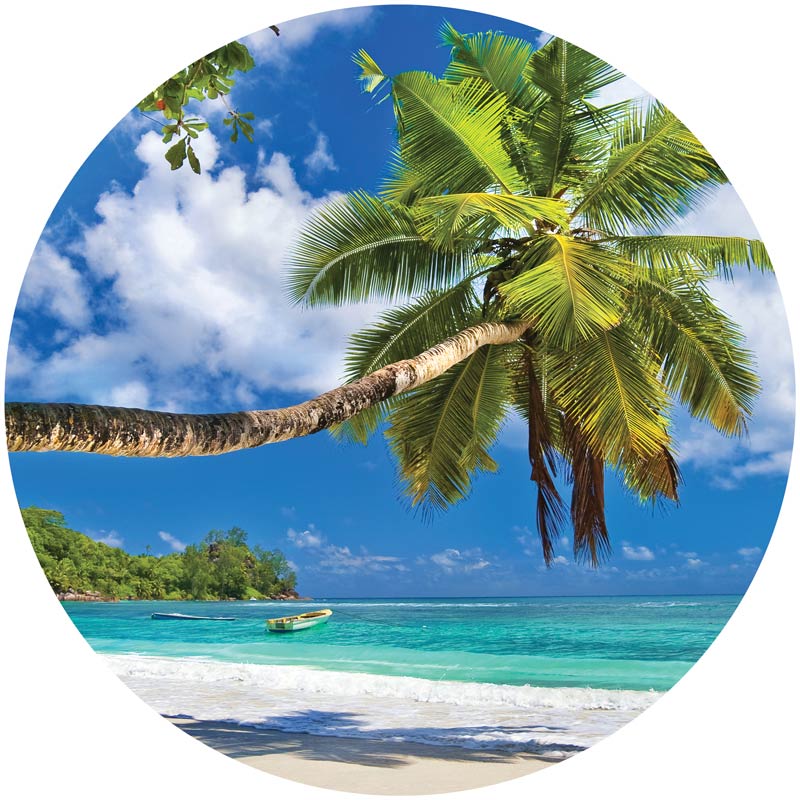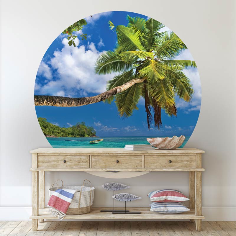 Die Runde Tapete mit der Palme am Meer ist ein echter Blickfang und die perfekte Ergänzung für jeden Raum.