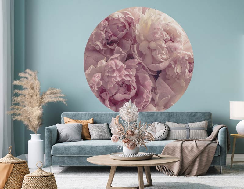 Mit der runden Tapete der rosa Pfingstrosen holen Sie sich Romantik ins Haus und bringen einen echten Blickfang an die Wand.